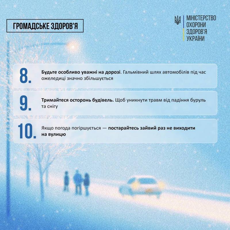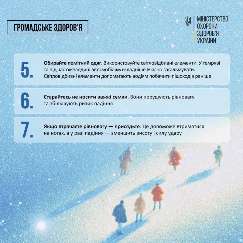 10 важливих правил, які допоможуть безпечніше пересуватися та зменшити ризик падінь і травм 09.01.2026 ❄️🌬 Надворі слизько та ожеледиця. І за прогнозами синоптиків морозна погода триматиметься в Україні ще не один день. МОЗ надає 10 важливих правил, які допоможуть безпечніше пересуватися та зменшити ризик падінь і травм. ❓Що робити, якщо ви таки впали? ☎️ У Центрі громадського здоров’я України кажуть: передусім необхідно оцінити свій стан. У разі удару голови або підозри на перелом — одразу телефонуйте 103 або 112. Навіть якщо серйозних ушкоджень немає, спостерігайте за самопочуттям кілька днів і зверніться до лікаря, якщо з’являться незвичні симптоми. ❗️Якщо ви не отримали серйозних травм, удар від падіння може залишити синці та спричиняти біль, які триматимуться кілька днів. 📌 Що можна зробити:✅ забезпечте спокій ураженій ділянці;✅ накладіть тугу пов’язку;.✅ щоб зменшити біль і набряк — прикладіть лід або холодний компрес, тримайте забиту частину тіла на підвищенні. Поділитись: Facebook Telegram