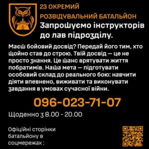 23 окремий розвідувальний батальйон запрошує інструкторів до лав підрозділу 21.04.2026 Маєш бойовий досвід? Передай його тим, хто щойно став до строю. Твій досвід — це не просто знання. Це шанс врятувати життя побратимів. Наша мета — підготувати особовий склад до реального бою: навчити діяти впевнено, виживати та виконувати завдання в умовах сучасної війни. ОБОВ’ЯЗКИ:• організація та проведення занять з бойової, тактичної, інженерної підготовки та тактичної медицини відповідно до програм і стандартів;• координація та контроль підготовки військовослужбовців;• проведення польових практичних занять (тактика, стрільба, фізична підготовка, тактична медицина тощо);• навчання бійців прийомів і правил ведення бою;• оцінка знань, умінь і навичок особового складу, впровадження рішень для підвищення їхнього рівня;• контроль дотримання дисципліни та заходів безпеки під час занять;• постійне вдосконалення власних навичок і розвиток у визначеному напрямі. ВИМОГИ• наявність бойового досвіду;• розуміння дій підрозділів на рівні групи, відділення і вище;• готовність постійно навчатися та розвиватися;• розвинені комунікативні навички;• фізична та моральна витривалість;• досвід інструкторської роботи (буде перевагою);• організованість, відповідальність, внутрішня дисципліна. УМОВИ:• мобілізація до кінця воєнного стану або служба за контрактом;• можливість переведення для чинних військовослужбовців;• грошове забезпечення залежно від вислуги, завдань і місця служби;• забезпечення формою, засобами індивідуального захисту та повноцінне харчування;• щорічна основна відпустка — 30 діб;• безкоштовне медичне забезпечення. Звертайтеся для отримання необхідної допомоги та роз’яснень 096 023 71 07.Щоденно – з 8:00 до 20:00 Офіційні сторінки батальйону в соцмережах : https://linktr.ee/23orb.army Поділитись: Facebook Telegram