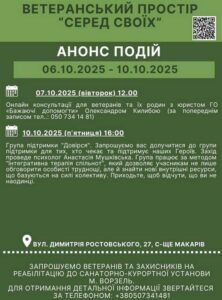 Анонс подій у ветеранському просторі “СЕРЕД СВОЇХ” 06.10.2025 🗓 06.10.2025 – 10.10.2025📍 вул. Димитрія Ростовського, 27, с-ще Макарів 📌 07 жовтня (вівторок) о 12:00Онлайн-консультації для ветеранів та членів їхніх родин з юристом ГО «Бажаючі допомогти» Олександром Килибою.Консультації проводяться за попереднім записом за номером: ☎️ 050 734 14 81. 📌 10 жовтня (п’ятниця) о 16:00Група підтримки «Довірся» — для тих, хто чекає і підтримує наших Героїв. Зустріч проведе психолог Анастасія Мушківська.Методика — інтегративна терапія спільнот, що допомагає учасникам ділитися власними переживаннями, знаходити внутрішні ресурси та підтримку у колі однодумців. Приходьте, щоб відчути — ви не самі 💙 👉 Також запрошуємо ветеранів та захисників України на реабілітацію до санаторно-курортної установи м. Ворзель. Для отримання детальної інформації телефонуйте:☎️ +380 50 734 14 81. Поділитись: Facebook Telegram