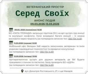📢 Анонс подій у ветеранському просторі «Серед Своїх» 09.03.2026 Запрошуємо захисників, ветеранів та їхні родини відвідати заходи цього тижня. 📅 11 березня 2026 (середа) | 12:00 🚐 Мобільний офіс «Ветеран Хаб».Надаватимуться індивідуальні психологічні та юридичні консультації для захисників, ветеранів та їхніх родин.🔹 Участь за попереднім записом за телефоном: 050 734 14 81. 📅 12 березня 2026 (четвер) | 13:00 🎨 Арттерапевтична зустріч для дружин ветеранів.Під час зустрічі учасниці працюватимуть з глиною та пастеллю, що допоможе зняти емоційну напругу та відновити внутрішній ресурс. Захід проводить БО «АДРА».🔹 Участь за попереднім записом за телефоном: 050 734 14 81. 📍 Місце проведення:вул. Димитрія Ростовського, 27, с-ще Макарів. Поділитись: Facebook Telegram