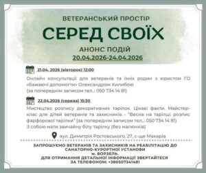 Анонс подій у ветеранському просторі «Серед Своїх» 17.04.2026 📢 Анонс подій на 20–24 квітня 2026 року 🔹 21 квітня 2026 року (вівторок),🕛 12:00Онлайн-консультації для ветеранів та їхніх родин за участі юриста ГС «Бажаючі допомогти» Олександра Килиби.📲 Участь за попереднім записом:050 734 14 81 🔹 22 квітня 2026 року (середа),🕒15:30🎨 Майстер-клас для дітей ветеранів та захисників«Весна на тарілці: розпис фарфорової тарілки».Під час заходу учасники дізнаються цікаві факти про декоративний розпис та створять власний виріб.❗️ З собою необхідно мати білу тарілку (без малюнків).📲 Участь за попереднім записом:050 734 14 81 📍 Місце проведення:вул. Димитрія Ростовського, 27, с-ще Макарів. 👥 Запрошуємо ветеранів та захисників на реабілітацію до санаторно-курортної установи у м. Ворзель. 📞 За детальною інформацією звертайтеся: +38 050 734 14 81 Поділитись: Facebook Telegram