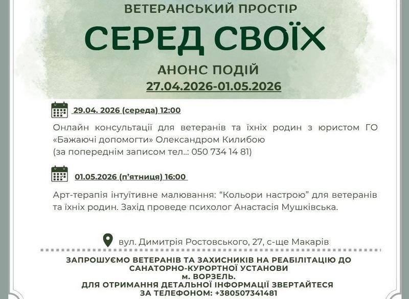 Анонс подій у ветеранському просторі «Серед Своїх» 27.04.2026 Анонс подій | 27 квітня – 1 травня 2026 року Запрошуємо ветеранів, захисників та їхні родини долучитися до корисних і підтримуючих заходів: 📅 29 квітня 2026 (середа), 12:00 Онлайн-консультації з юристом.Індивідуальні консультації для ветеранів та членів їхніх родин проведе юрист ГО «Бажаючі допомогти» Олександр Килиба.🔹 Участь за попереднім записом за телефоном: 050 734 14 81 📅 1 травня 2026 (п’ятниця), 16:00 Арт-терапія «Кольори настрою».Інтуїтивне малювання як спосіб емоційного відновлення та самовираження. Захід проведе психолог Анастасія Мушківська. 📍 Місце проведення: с-ще Макарів, вул. Димитрія Ростовського, 27 💙 Також запрошуємо ветеранів та захисників на реабілітацію у санаторно-курортній установі в місті Ворзель. 📞 Деталі за телефоном: +380 50 734 14 81 Будемо раді бачити вас у просторі підтримки «Серед Своїх». Поділитись: Facebook Telegram