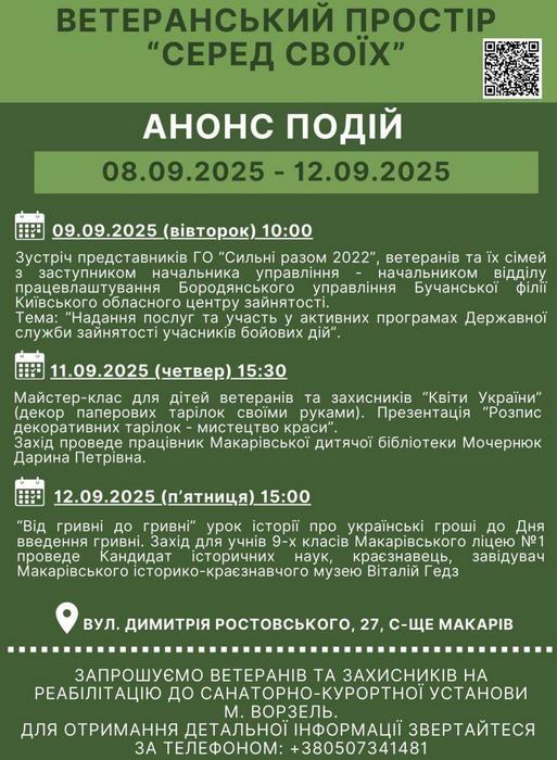 Анонс подій ветеранського простору “СЕРЕД СВОЇХ“ 08.09.2025 Анонс подій | 08.09.2025 – 12.09.2025📍 вул. Димитрія Ростовського, 27, с-ще Макарів 🗓 09.09.2025 (вівторок) | 10:00🤝 Зустріч представників ГО «Сильні разом 2022», ветеранів та їхніх родин із заступником начальника управління – начальником відділу працевлаштування Бородянського управління Бучанської філії Київського обласного центру зайнятості. Тема: «Надання послуг та участь у програмах Державної служби зайнятості для учасників бойових дій». 🗓 11.09.2025 (четвер) | 15:30🎨 Майстер-клас для дітей ветеранів та захисників «Квіти України» (декор паперових тарілок своїми руками). Також — презентація «Розпис декоративних тарілок — мистецтво краси». 🗓 12.09.2025 (п’ятниця) | 15:00💰 Урок історії «Від гривні до гривні» до Дня введення гривні. Також запрошуємо ветеранів та захисників на реабілітацію до санаторно-курортної установи в м. Ворзель.📞 Деталі за телефоном: +380507341481 Поділитись: Facebook Telegram