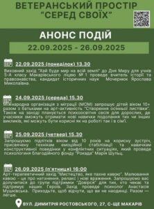 Анонс подій ветеранського простору “СЕРЕД СВОЇХ“ 22.09.2025 📍 с-ще Макарів, вул. Димитрія Ростовського, 27 24.09.2025 (середа) — 15:30🎨 Арт-активність від Міжнародної організації з міграції (МОМ) для дітей 10+ та їхніх батьків — «Створення осінньої листівки».👨👩👧 Паралельно для дорослих відбудеться психоосвітня сесія, де учасники дізнаються нові техніки подолання викликів у роботі та сім’ї. 25.09.2025 (четвер) — 15:30🧠 Зустріч для підлітків 10+Тема: техніки емоційної стабілізації та навички конструктивної поведінки у конфліктних ситуаціях. 26.09.2025 (п’ятниця) — 16:00☕️ Арт-терапевтичний захід «Мистецтво, яке пахне кавою».Малювання кавою — це натхнення, релакс і нові враження.💙 Запрошуємо до групи підтримки «Довірся» для тих, хто чекає та підтримує наших Героїв. 🤝 Приходьте, щоб відчути, що ви не самі. Разом легше! Поділитись: Facebook Telegram