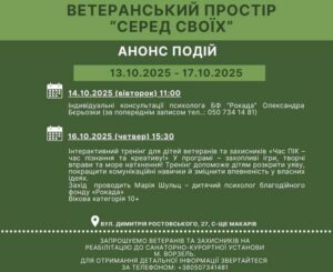 Анонс подій ветеранського простору “СЕРЕД СВОЇХ” 13.10.2025 📅 13–17 жовтня 2025 року📍 вул. Димитрія Ростовського, 27, с-ще Макарів Запрошуємо ветеранів, захисників України та їхні родини до участі в подіях, сповнених підтримки, тепла й натхнення. 🧠 14 жовтня (вівторок), 11:00 Індивідуальні консультації психолога. 👨⚕️ Проводить: Олександр Бєрьозка, психолог Благодійного фонду «Рокада».📞 Запис за телефоном: 050 734 14 81 🎨 16 жовтня (четвер), 15:30 Інтерактивний тренінг для дітей ветеранів та захисників.✨ «Час ПІК — час пізнання та креативу!». У програмі — захопливі ігри, творчі завдання, спілкування та море позитивних емоцій!👩🏫 Проводить: Марія Шульц, дитячий психолог БФ «Рокада»👧 Вікова категорія: 10+ 📌 Додатково:Ветеранів та захисників запрошуємо пройти реабілітацію в санаторно-курортній установі м. Ворзель.📞 Для отримання детальної інформації телефонуйте: +38050 734 14 81 🤝 Простір “СЕРЕД СВОЇХ” — це місце, де зрозуміють, підтримають і допоможуть зробити крок до внутрішнього відновлення. Приходьте, адже разом ми сильніші! 💛💙 Поділитись: Facebook Telegram