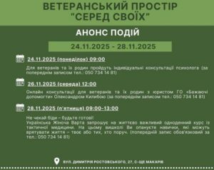Анонс подій ветеранського простору “СЕРЕД СВОЇХ” 24.11.2025 АНОНС ПОДІЙ📍 вул. Димитрія Ростовського, 27, с-ще Макарів 📅 26 листопада 2025 року (середа), 12:00 Онлайн-консультації для ветеранів та їхніх родин. Юрист ГО «Бажаючі допомогти» Олександр Килиба надаватиме кваліфіковані консультації з правових питань.📞 Попередній запис обов’язковий:050 734 14 81 📅 28 листопада 2025 року (п’ятниця), 09:00–13:00 Одноденний курс із тактичної медицини від «Української Жіночої Варти». Не чекай біди — будь готовий! Учасники опанують базові, але життєво необхідні навички, які можуть врятувати життя — своє або тих, хто поруч. 📞 Попередній запис обов’язковий:050 734 14 81 Поділитись: Facebook Telegram