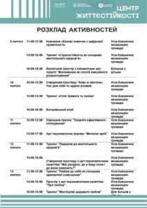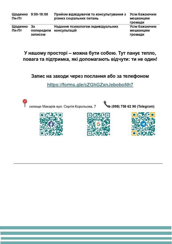 💙 Час подбати про себе – разом із Центром життєстійкості 06.02.2026 Центр життєстійкості запрошує мешканців громади на теплі та корисні зустрічі, що відбудуться з 09 по 13 лютого 2026 року. Підготовлено затишний розклад активностей і занять, які допомагають відновити сили, знайти підтримку та трохи сповільнитися у щоденних справах. Це простір, де можна побути в колі людей, які розуміють, отримати емоційну підтримку, знайти нові внутрішні опори та провести час із користю для себе й родини. 📍 Адреса: с-ще Макарів, вул. Сергія Корольова, 7(приміщення ЦНАПу, 2 поверх)📞 Телефон: +38 (098) 758 62 90🕘 Графік роботи: понеділок–п’ятниця, з 9:00 до 18:00 👉 Розклад активностей на тиждень уже готовий – обирайте зустрічі та приходьте до Центру. Поділитись: Facebook Telegram