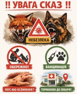 ‼️ До уваги мешканців громади 16.03.2026 У зв’язку з виявленим випадком сказу тварин на території Бучанського району населені пункти Макарівська Буда та Соболівка нашої громади оголошено такими, що перебувають у загрозливій зоні. 🦠 Сказ – це гостра інфекційна хвороба з тяжким ураженням центральної нервової системи, яку спричиняє вірус. Людина може заразитися переважно через укуси хворої тварини або потрапляння її слини на пошкоджену шкіру чи слизові оболонки. Найчастіше джерелом інфекції є дикі хижі тварини (лисиці, вовки), а також домашні коти, собаки чи сільськогосподарські тварини. Однією з основних причин захворювання людей є несвоєчасне звернення за медичною допомогою. 📌 Щоб уберегтися від сказу, необхідно:▫️ уникати контактів із безпритульними та дикими тваринами;▫️ у разі зміни поведінки домашньої тварини негайно звертатися до ветеринарного лікаря;▫️ не допускати контактів домашніх тварин із бродячими;▫️ регулярно проводити профілактичну вакцинацію домашніх тварин проти сказу;▫️ у разі укусу або потрапляння слини тварини на шкіру чи слизові оболонки негайно звернутися за медичною допомогою. 📍 За консультацією можна звернутися до Бучанської районної державної лікарні ветеринарної медицини: с-ще Макарів, вул. Димитрія Ростовського, 152. Просимо мешканців громади бути уважними та дотримуватися встановлених обмежень. Безпека — спільна відповідальність. Поділитись: Facebook Telegram