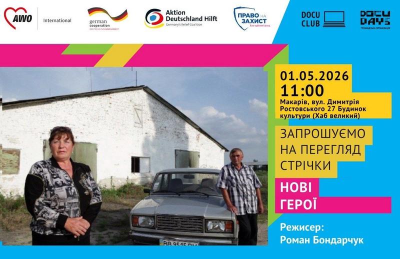 🎬 Інтеграційний захід: кінопоказ документального фільму «Нові герої» 27.04.2026 Запрошуємо вас долучитися до перегляду документального фільму «Нові герої» (режисер — Р. Бондарчук), який відбудеться в межах реалізації проєкту «Зміцнення стійкості вразливих домогосподарств і постраждалих від війни громад шляхом відновлення». Цей захід спрямований на посилення соціальних зв’язків, взаємної підтримки та згуртованості в громаді. Фільм «Нові герої» — це три документальні історії звичайних українців, які, попри складні обставини, не змирилися з несправедливістю. Кожна з історій показує, як люди можуть змінювати своє життя та впливати на громаду: започатковувати власну справу, відстоювати права, об’єднуватися задля захисту спільних інтересів.Це історії про сміливість, стійкість і віру в те, що навіть у найскладніших умовах можна знайти шлях до змін. 📅 Дата: 01 травня🕚 Час: 11:00📍 Місце: Хаб у Центрі культури і дозвілля🎤 Модератор: Олег Охредько 🔗 Реєстрація за посиланням: https://docs.google.com/forms/d/e/1FAIpQLSe9Sru1Ms5Jb3Yf0P8ex_pFQEjqRtoGG7k8AXEJ6-SrYRFkFw/viewform?usp=sharing&ouid=101926905067410885585 Після реєстрації детальну інформацію про захід буде надіслано на вашу електронну адресу. Захід організовує БФ «Право на захист» у межах діяльності кіноклубу Docudays UA у співпраці з ГО «Докудейз» за сприяння AWO International. Ініціатива реалізується за фінансової підтримки Федерального міністерства економічного співробітництва та розвитку Німеччини (BMZ) та Aktion Deutschland Hilft (ADH). Поділитись: Facebook Telegram