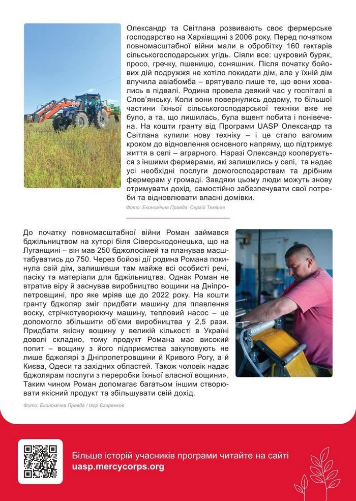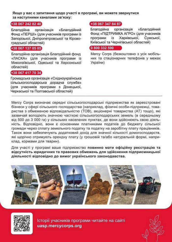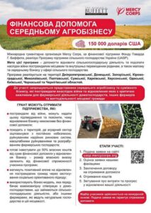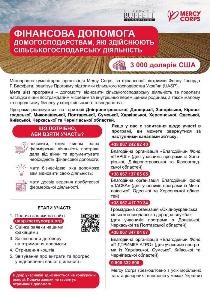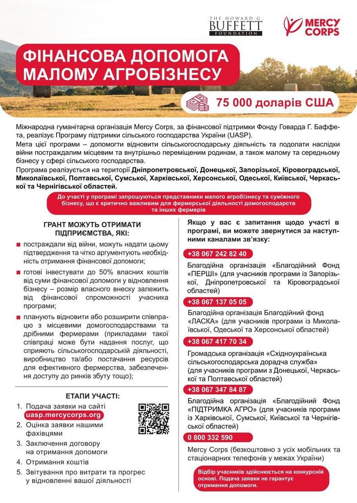 Оголошується набір учасників Програми підтримки сільського господарства України 25.03.2026 Mercy Corps у співпраці з БЛАГОДІЙНИМ ФОНДОМ «ПІДТРИМКА АГРО» оголошує набір учасників Програми підтримки сільського господарства України, що реалізується у Київській, Харківській, Сумській та Чернігівській областях (за винятком територій активних бойових дій та зон із високим ризиком). 💰 Програма фінансується Фондом Говарда Г. Баффета та має на меті допомогти фермерам, які постраждали від війни, шляхом надання грошових грантів на відновлення засобів до існування. 📌 Хто може податися: ✅ Домогосподарства, фермери, малі та середні агробізнеси з числа внутрішньо переміщених осіб та місцевого населення, які постраждали внаслідок війни (втрата техніки, обладнання, приміщень, поголів’я тварин тощо);✅ Учасники, які не мають достатніх ресурсів для самостійного відновлення після наслідків війни, зокрема місцеве населення та внутрішньо переміщені особи, у тому числі суб’єкти агробізнесу. 📌 Компоненти програми: Фінансова допомога домогосподарствам і дрібним фермерам. 💸 Середня сума гранту — 3 000 USD. Для тих, хто здійснює сільськогосподарську діяльність і обробляє до 10 га землі. Фінансова допомога малому агробізнесу 💸 Середня сума гранту — 75 000 USD. Для бізнесів до 500 га, що забезпечують домогосподарства послугами чи ресурсами, створюють ринкові можливості. Готовність інвестувати до 50% власних коштів. Фінансова допомога середньому агробізнесу 💸 Середня сума гранту — 150 000 USD. Для бізнесів від 500 до 3 000 га, що є критично важливими для аграрного сектору та місцевої економіки. Готовність інвестувати до 50% власних коштів. Консультаційні послуги з юридичних та фінансових питань. Професійна підтримка фермерам і агробізнесам із питань податків, кредитів, державних пільг та інших аспектів відновлення діяльності. 👉 Деталі щодо умов участі, критеріїв та форми заявки доступні на сайті: https://uasp.mercycorps.org Поділитись: Facebook Telegram