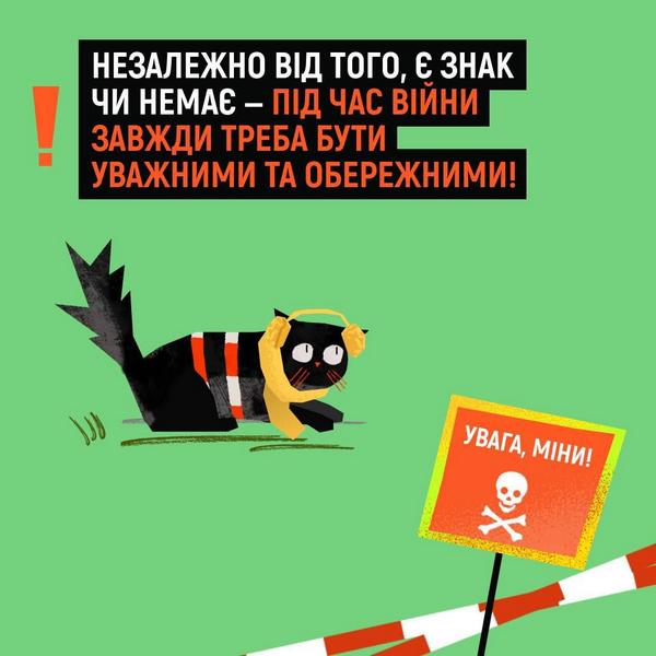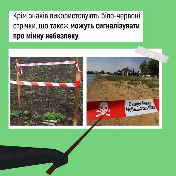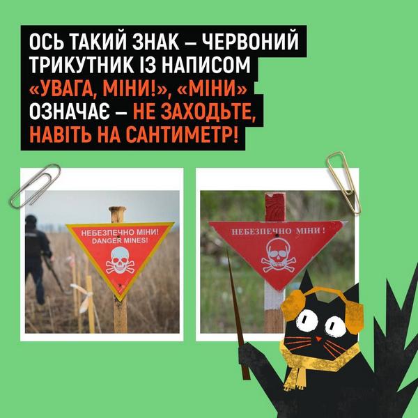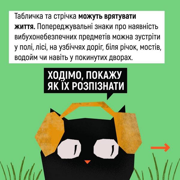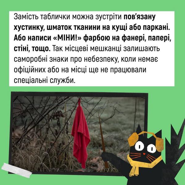 Під час війни важливо завжди дивитися не лише під ноги, але й довкола! 19.11.2025 Адже таблички, стрічки чи навіть зав’язана на кущі хустинка часто з’являються не просто так. Ці попереджувальні знаки сигналізують, що далі на шляху можуть трапитися вибухонебезпечні предмети 🚩 Гортайте картки, щоб разом із котом Нечіпуном впізнати усі знаки мінної небезпеки👆 Подивіться їх разом із дітьми: це хороший спосіб нагадати їм про правила поводження із підозрілими предметами💥 ДСНС України Поділитись: Facebook Telegram