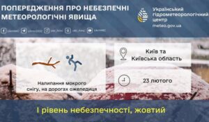 ‼️Попередження про небезпечні метеорологічні явища по території Київщини 22.02.2026 23 лютого налипання мокрого снігу. На дорогах ожеледиця. 🟡I рівень небезпечності, жовтий Поділитись: Facebook Telegram