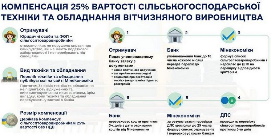 🚜 Програма компенсації вартості сільгосптехніки вітчизняного виробника 02.12.2025 Управління агропромислового розвитку Київської обласної державної адміністрації інформує про дію Постанови Кабінету Міністрів України від 01.03.2017 №130 «Про затвердження Порядку використання коштів, передбачених у державному бюджеті для часткової компенсації вартості сільськогосподарської техніки та обладнання вітчизняного виробництва» (зі змінами). Держава надає сільськогосподарським товаровиробникам часткову компенсацію у розмірі 25% вартості придбаної української техніки та обладнання (без урахування ПДВ). Компенсація надається на безповоротній основі та стосується техніки, оплата за яку здійснена через уповноважений банк. 📌 Перелік техніки, що підлягає компенсації 👉 З актуальним переліком сільськогосподарської техніки та обладнання вітчизняного виробництва можна ознайомитися на офіційному сайті Міністерства економіки України за посиланням:https://cutt.ly/httWAydH 📌 Порядок подачі документів Для отримання часткової компенсації агровиробники подають до уповноваженого банку заявку та такі документи:▫️ копію платіжного доручення або іншого документа, що підтверджує оплату техніки чи обладнання;▫️ акт приймання-передачі;▫️ свідоцтво про реєстрацію транспортного засобу або машини (у разі, якщо техніка підлягає державній чи відомчій реєстрації). 🔗 Форму заявки можна завантажити за посиланням:https://cutt.ly/3ttWFBHY 📆 Строки подачі заявок ▫️ За техніку, придбану до 1 грудня поточного бюджетного періоду — до 5 грудня поточного року.▫️ За техніку, придбану з 1 грудня — до 1 квітня наступного бюджетного періоду. Поділитись: Facebook Telegram