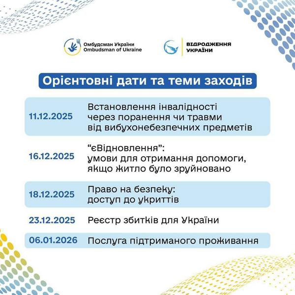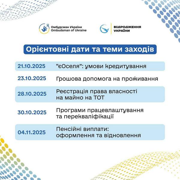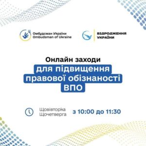Стартує серія правопросвітницьких онлайн-заходів для внутрішньо переміщених осіб 09.10.2025 У рамках співпраці Секретаріату Уповноваженого Верховної Ради України з прав людини та громадської організації «Відродження України 2022», за підтримки Офісу Ради Європи в Україні заплановано організацію та проведення вебінарів для внутрішньо переміщених осіб та осіб, які постраждали від збройної агресії проти України. Учасників чекають виступи експертів і представників центральних органів виконавчої влади, які розкажуть про практичні інструменти підтримки ВПО, актуальні програми допомоги та механізми захисту прав. Під час вебінарів передбачена можливість ставити запитання спікерам у режимі реального часу. 🧑💻 Зареєструватися на заходи можна за посиланням: https://forms.gle/DEiMagXSh4pJgqXi7. Перед початком вебінару учасники на електронну адресу отримають детальну програму та посилання для підключення через Zoom. 📆 Вебінари розпочнуться з 21 жовтня 2025 року та проводитимуться щовівторка та щочетверга з 10:00 до 11:30 до 22 січня 2026 року. 🔗 Посилання на анонс відповідних заходів: https://surl.li/ilzkov ☝️ Якщо маєте додаткові запитання, звертайтеся на електронну пошту ГО «Відродження України 2022»:📧 revivalukr2022@gmail.com Поділитись: Facebook Telegram