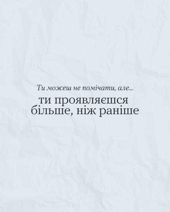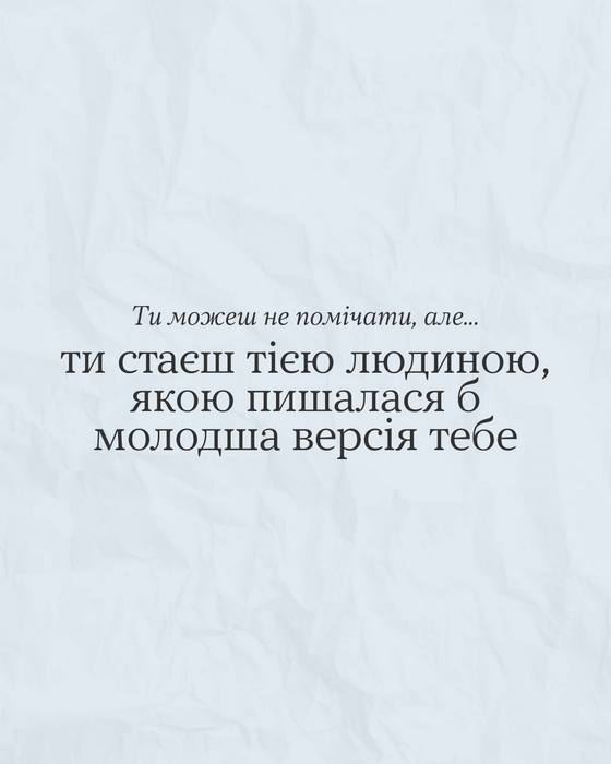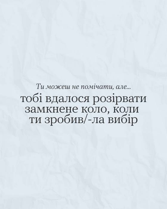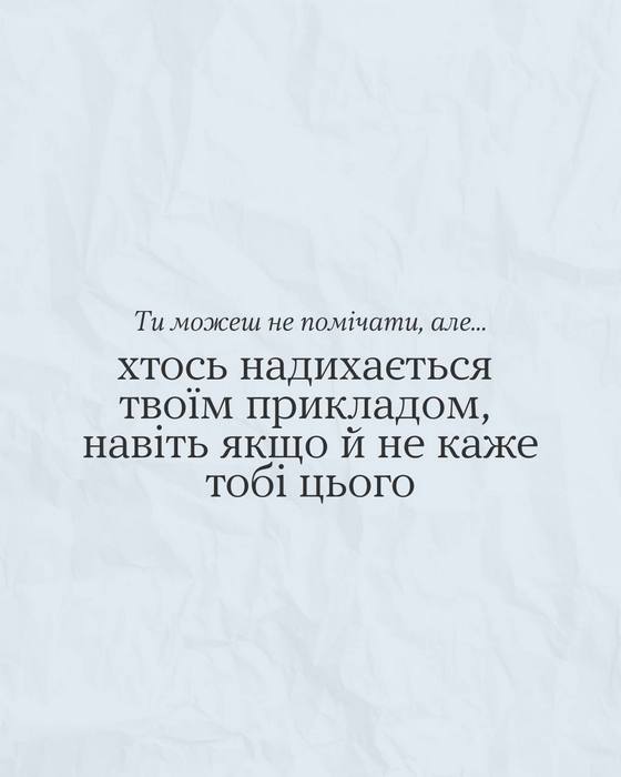 Ти можеш не помічати, але… 19.02.2026 Завжди знайдуться причини, щоб тобі пишатися собою. Але якщо їх не бачиш, подивися в каруселі 👉 Можливо, надихнешся і згадаєш той самий випадок, як тобі вдалося відстояти свої межі, проявити ініціативу чи підтримати іншу людину добрим вчинком. Це ж великий привід для гордості, порадій за себе 👏 Поділитись: Facebook Telegram
