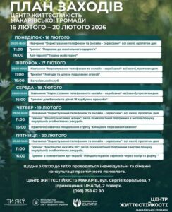 ✨ Тиждень підтримки та відновлення в Центрі життєстійкості ✨ 13.02.2026 Іноді найцінніше – дозволити собі зупинитися, видихнути й трохи сповільнитися. Саме для цього Центр життєстійкості запрошує мешканців громади на теплі та корисні зустрічі з 16 по 20 лютого 2026 року. Центр підготував затишний розклад активностей і занять, що допомагають:💛 відновити внутрішні ресурси💛 отримати емоційну підтримку💛 знайти нові внутрішні опори💛 провести час із користю для себе й родини 📍 Адреса: с-ще Макарів, вул. Сергія Корольова, 7 (приміщення ЦНАПу, 2 поверх)📞 Телефон: +38 (098) 758 62 90🕘 Графік роботи: понеділок–п’ятниця, з 9:00 до 18:00 👉 Розклад активностей на тиждень уже готовий – обирайте зустрічі та приходьте до Центру. Життєстійкість починається з турботи про себе 💙 Поділитись: Facebook Telegram