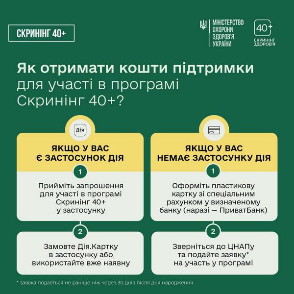В Україні стартувала Національна програма Скринінг здоров’я 40+: коли і як можна скористатись послугою❓ 02.01.2026 Національна програма Скринінг здоровʼя 40+, спрямована на раннє виявлення серцево-судинних захворювань, цукрового діабету і проблем психічного здоровʼя для українців та українок 40+, запрацювала у перший день 2026 року. І вже наприкінці цього місяця українці та українки віком від 40 років почнуть отримувати перші сповіщення-запрошення пройти скринінг. Як це працює❓ 1️⃣ Запрошення на скринінг надходитиме в застосунок Дія на 30-й день після дня народження — для людей віком від 40 років і більше. 2️⃣ Після підтвердження участі в програмі 2000 гривень зараховуються на Дія.Картку протягом семи днів. Кошти можна використати виключно для оплати скринінгу. 3️⃣ Для тих, хто не користується застосунком Дія, передбачена можливість оформлення банківської картки та подання заявки через ЦНАП. Це можна зробити через 30 днів після дня народження. Національний скринінг здоров’я 40+ включає: ✅ анкетування та оцінку індивідуальних ризиків (зокрема серцево-судинних захворювань, ризику цукрового діабету 2 типу та стану психічного здоров’я);✅ фізикальне обстеження (вимірювання артеріального тиску, оцінка частоти та ритму серця, антропометрія);✅ лабораторні дослідження, що показують роботу серця, судин і нирок;✅ індивідуальні рекомендації лікаря щодо способу життя та стану здоров’я, у разі потреби — призначення ліків чи направлення на подальші обстеження чи лікування. 👉🏻 Більше про те, коли ви отримаєте запрошення на проходження Скринінгу здоров’я 40+, як оформити послугу та в який термін — розповідаємо у каруселі. 🔗Детальну інформацію про програму Скринінг здоров’я 40+ та відповіді на найпоширеніші запитання знайдете за посиланням: screening.moz.gov.ua Там же буде доступний і перелік медичних закладів-учасників. Поділитись: Facebook Telegram