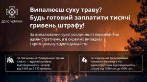 Весна – це не лише про прибирання, а й про відповідальність 🌱 18.03.2026 Разом із наведенням ладу на подвір’ях багато хто досі обирає небезпечний спосіб – спалювання сухої трави. ☝️ Важливо пам’ятати: це заборонено законодавством України. Такі підпали легко виходять з-під контролю і можуть обернутися серйозними наслідками:▪️ знищенням житлових будинків та господарських споруд▪️ масштабними пожежами в лісах і на полях▪️ загибеллю тварин і сильним забрудненням повітря ⚠️ За спалювання сухої рослинності передбачена відповідальність:▪️ для громадян – від 3 060 до 6 120 грн▪️ для посадових осіб – від 15 300 до 21 420 грн 🚒 Рятувальники наголошують: не створюйте небезпеку для себе та інших! ☎️ Якщо помітили загоряння сухої трави – одразу телефонуйте 101. Бережімо природу, свої домівки та життя разом. Поділитись: Facebook Telegram