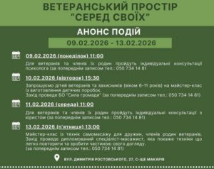 У ветеранському просторі «Серед своїх» протягом тижня відбудуться зустрічі та заходи для ветеранів, членів їхніх родин і дітей захисників. Простір залишається місцем підтримки, спілкування та корисних зустрічей, де кожен може отримати фахову допомогу й провести час у безпечній, дружній атмосфері.