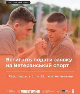 Встигніть подати заявку на Ветеранський спорт 09.10.2025 📍Реєстрація з 1 по 20 жовтня включно 👉 Ветерани та ветеранки можуть отримувати 1 500 грн кожні три місяці на спорт. Гроші можнавитратити на тренажерний зал, басейн чи інші активності. Що необхідно? ✅ верифікований РНОКПП (картка платників податків)✅ статус УБД та/або ОІВВ у ЄДРВВ✅ Дія.Картка у банку-учаснику програми 📲 подати заяву в застосунку Дія: зайти у Дію 👉 сервіси 👉«Ветеранський спорт»обрати Дія.Картку для виплат та надіслати заявукошти надходитимуть автоматично через шість робочих днів після оформлення заявки на Дія.Картку.Зверніть увагу! Якщо Ви отримували кошти у третьому кварталі та використали їх на заняття спортом, то заявку у четвертому кварталі подавати не потрібно, кошти надійдуть автоматично. Де можна використати кошти?У будь-якому спортивному закладі, який працює за кодом:7941 «Фізична культура»,7997 «Клуби — заміські клуби, членство». 🔗 Список спортивних закладів можна переглянути на сайті Мінветеранівhttps://mva.gov.ua/veteranam/httpsdocsgooglecomspreadsheetsd1ww_ptxltlkl1klyfh2c86c6z_7a3poa4editgid1071425060gid1071425060?fbclid=IwY2xjawNUOsdleHRuA2FlbQIxMAABHrvLhWDpBztySWTsryF1txU0r93Aiq-K-scRb0COVDKgfHucfmoPgg-73rrQ_aem_G1yuGANb24LfgK1EiI4qzQ🔗 Відповіді на популярні питання про програму тутhttps://mva.gov.ua/prescenter/category/86-novini/veteranskiy-sport-startuvala-programa-pidtrimki?fbclid=IwY2xjawNUOtZleHRuA2FlbQIxMAABHhU-2c2n-SHtWGMz17OOxCe2AoIQF7rZWgp0tSxrFP7DBFruVeUeM0Be_XhI_aem_Agi2KmH9MXUnc476QKdg3g Проєкт реалізовано Міністерством у справах ветеранів України спільно з Міністерство цифрової трансформації України на виконання Стратегії ветеранської політики та реалізації Національної стратегії зі створення безбарʼєрного простору в Україні, розробленої за ініціативи Першої леді Олени Зеленської. Поділитись: Facebook Telegram